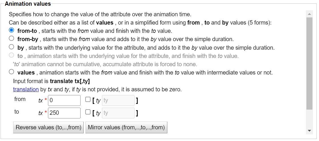This pane allow to specify the transform parameter values with one of the 4 possible syntaxes (from-to, from-by, by, values). The 'to' syntax (from animate element) has no meaning with animateTransform element.